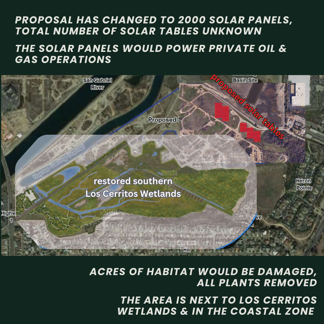 | Friendly Reminder: We still need you to write a letter! Email template here! What we know about the proposed revised solar panel project. The majority of the solar panels would remain adjacent to some of the Los Cerritos Wetlands’ most biologically sensitive areas, likely affecting the fragile and threatened species that rely on the wetlands to survive. The project would now produce 1.2 megawatts, consist of two separate solar arrays with about 2,000 solar panels, and an undetermined number of solar tables….all to power oil and gas operations. Here is our most recent letter to the City of Seal Beach outlining our concerns. You can use points in our letter to write your own letter to the City. We remain concerned about the impacts on nearby wildlife. In fact, we are so concerned that we asked respected biological experts at All Hands Biological Consulting to review the project. You can find their review here. Very concerningly, there is insufficient review of the potential for solar panel glare to confuse birds and other wildlife, despite the promised anti-glare coating. And if the project kills birds, how many is acceptable, and what number might trigger additional mitigation? The applicant can self-report, and beyond that, neither the applicant nor the Planning Commission is required to take any specific action to reduce bird deaths. Before (or if) this project moves forward, we need answers to those questions, and more. Keep voicing your concerns to the Seal Beach City Council regarding the potential impacts on the wetlands and neighboring communities. Ask for a full analysis of the project. Send a note to Shaun Temple, Planning Manager for the City of Seal Beach. Tell him that an Environmental Impact Report is the appropriate level of review for a project that could have significant impacts on the wetland wildlife that reside in this rare habitat. Ask him to share your views with the City Council. Attend the Seal Beach City Council meeting on Feb 23 at 7:00 PM. Tell them that if these solar panels are installed, they will likely remain for many years. In an era of rising seas and extreme weather, it is just wrong to add more stressors on the fragile and threatened species that rely on the remaining few acres of Los Cerritos Wetlands. At a minimum, there should be a full environmental review to better understand the impacts, how they will affect local wildlife, and the available alternatives. With appreciation, Elizabeth Lambe Executive Director Los Cerritos Wetlands Land Trust P.S. The accompanying materials for the proposed solar panel agenda item were just posted on the City of Seal Beach website. You can find them here. |